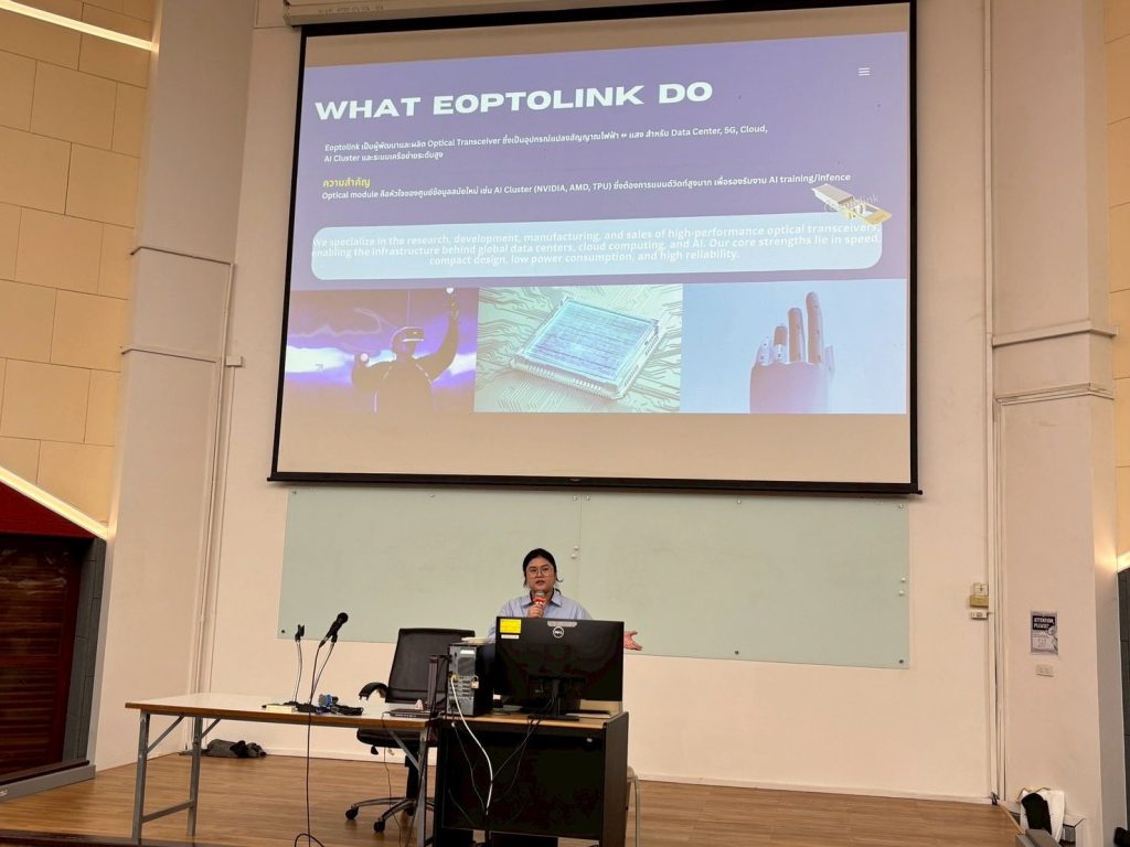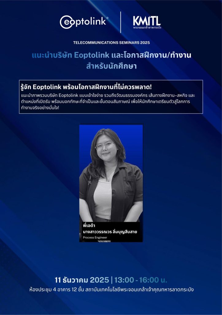 ภาควิชาวิศวกรรมโทรคมนาคม คณะวิศวกรรมศาสตร์ สจล. ขอเชิญนักศึกษา บุคลากร และผู้สนใจ เข้าฟังการบรรยายพิเศษ แนะนำบริษัท Eoptolink และโอกาสฝึกงาน/ทำงานสำหรับนักศึกษา โดย Process Engineer ศิษย์เก่ารุ่นพี่ ภาควิชาวิศวกรรมโทรคมนาคม สจล. คือ คุณวรรณวร ลิ่มบุญสืบสาย (พี่เอด้า) ณ.ห้องบรรยาย Slope 4 ตึก 12 ชั้น คณะวิศวกรรมศาสตร์ สจล.ในวันพฤหัสบดีที่ 11 ธันวาคม 2568 เวลา 13:00-16:00 น.