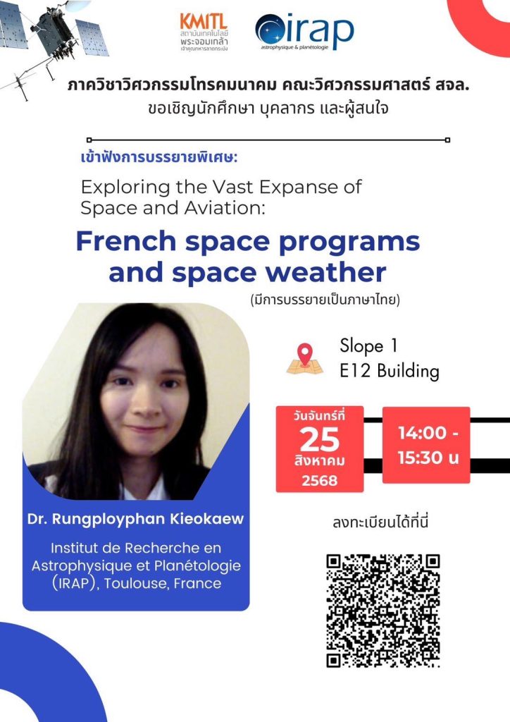 ภาควิชาวิศวกรรมโทรคมนาคม คณะวิศวกรรมศาสตร์ สจล. ขอเชิญนักศึกษา บุคลากร และผู้สนใจ เข้าฟังการบรรยายพิเศษ Exploring the Vast Expanse of Space and Aviation: French space programs and space weather ที่ห้องบรรยาย Slope 1 ตึก 12 ชั้น คณะวิศวกรรมศาสตร์ ในวันจันทร์ที่ 25 สิงหาคม 2568 เวลา 14:00 – 15:30 น. โดยสามารถลงทะเบียนได้ที่ QR ด้านล่าง